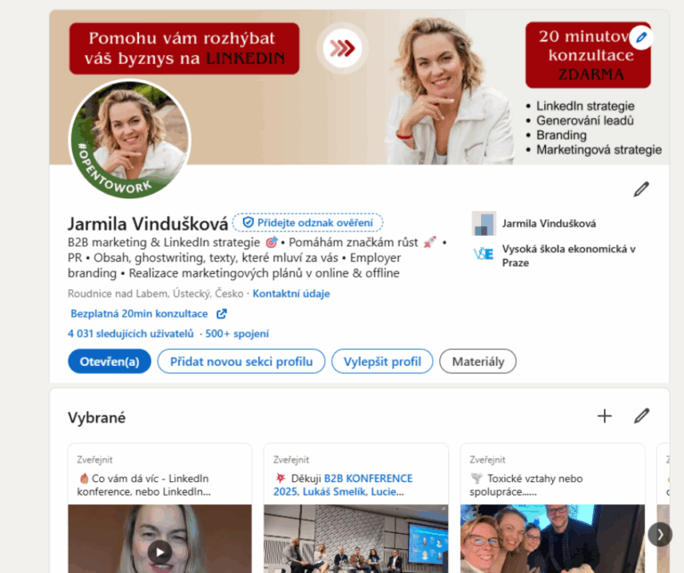 Pokud přemýšlíte, jak oživit svůj LinkedIn profil a posunout svou prezentaci na novou úroveň, vřele doporučuji Jarmilu. Pomohla mi dát dohromady nejen profil samotný, ale i celkovou obsahovou strategii – od konkrétních příspěvků až po to, jak se lépe prezentovat v mém oboru fitness pro ženy. Díky jejím radám a důrazu na detaily, které bych sama přehlédla, se mi podařilo během prvního měsíce zvýšit dosah o 2000 %, zlepšit viditelnost, návštěvnost profilu i skóre SSI. Již během prvního měsíce jsem navázala zajímavé partnerství s jinou organizací a získala 2 leady (potenciální kontakty) do naší sítě klubových fitek pro ženy aurafit.cz. Jarmila má skvělý cit pro to, co na LinkedIn opravdu funguje! (květen 2025)